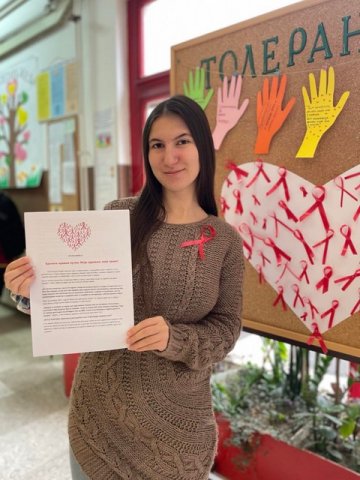 v Ношењем црвене трачице, дали смо јасну поруку подршке и разумевања за све који живе са ХИВ-ом или сидом, и исказали бригу и посвећеност борби против ХИВ/AИДС-а.